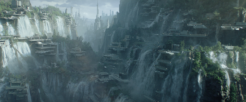 “As a general rule, we have to make sure if we’re doing a full CG shot that we use the same lens kit with visual effects that we use practically,” MacLean remarks. “The vendors are not allowed to step outside that lens kit. If we’re an anamorphic show, it’s all anamorphic defocus and bokeh. We have to treat everything in that same way; otherwise, it will take you out of it if you change the camera characteristics too much.” The pleasure planet of Kalgan is introduced in Episode 301. “Kalgan went through many iterations because people perceive pleasure in different ways. Some of the original concept art had these floating lilypad-style pools and neon lights. It was more like Macao or Thailand, but after realizing how much they would have to build practically, and the logistics of shooting in a place like that, we ended up going more grounded with everything. Rory Cheyne, our Production Designer, went more to Lake Como in Italy for inspiration. Once we got that concept art with the waterfalls, we decided that was the way to go. We still ended up going to Spain to shoot the villa when we introduce Beyta and Toran Mallow, which we replaced and extended digitally to make it fit in the rest of the world we built.”