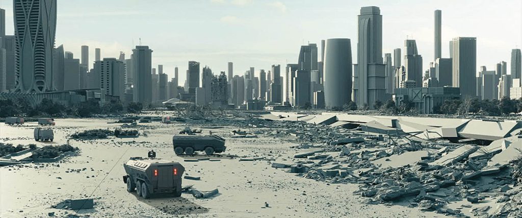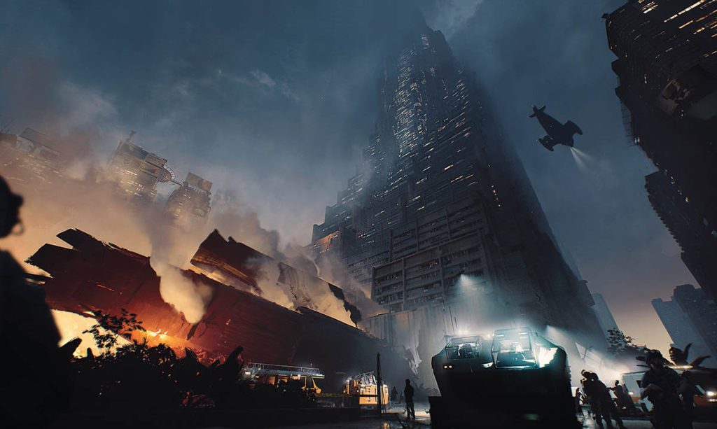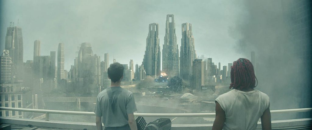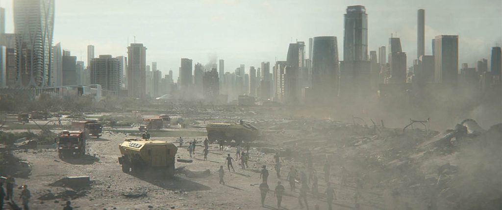 Prodigy City was a major environment build. “We had gotten some concept art from the art department, and Noah was interested in telling the substory of what he called the ‘plus versus minus’ of society,” Rothbart states. “The idea that the wealthier lived above ground and the poor people live in all these dwellings below ground. We tried to come up with a structure that would both be believable and make sense to that concept. We added these levels of the city. Most of the events in this particular season take place in the upper level of that city. It’s a cool concept that I’m hoping Noah will investigate further next season.” Plate photography was always the starting point. “We would strip out a lot of the buildings, then rebuild our buildings on top of that, as well as the lower area underneath it so we felt more of that futuristic city. We’ve got some really huge shots like the big ‘oner’ when they go to the crash site, which was insanely difficult with so many layers and so much going on.” Sparks are a prominent atmospheric in the crash site. Rothbart notes, “We took what was there and tried to minimize the sparks in a lot of places and then rebuild them back with our own sparks so we could be more specific with the art direction.”