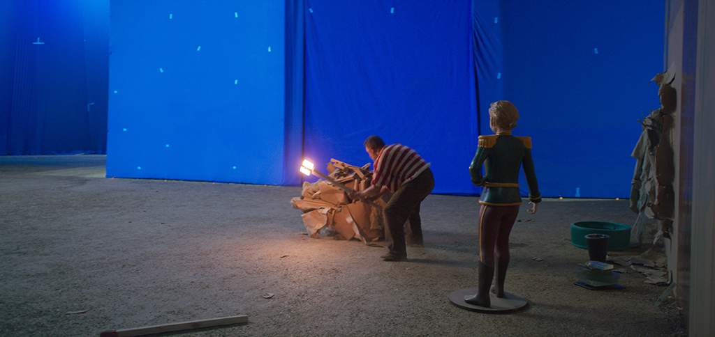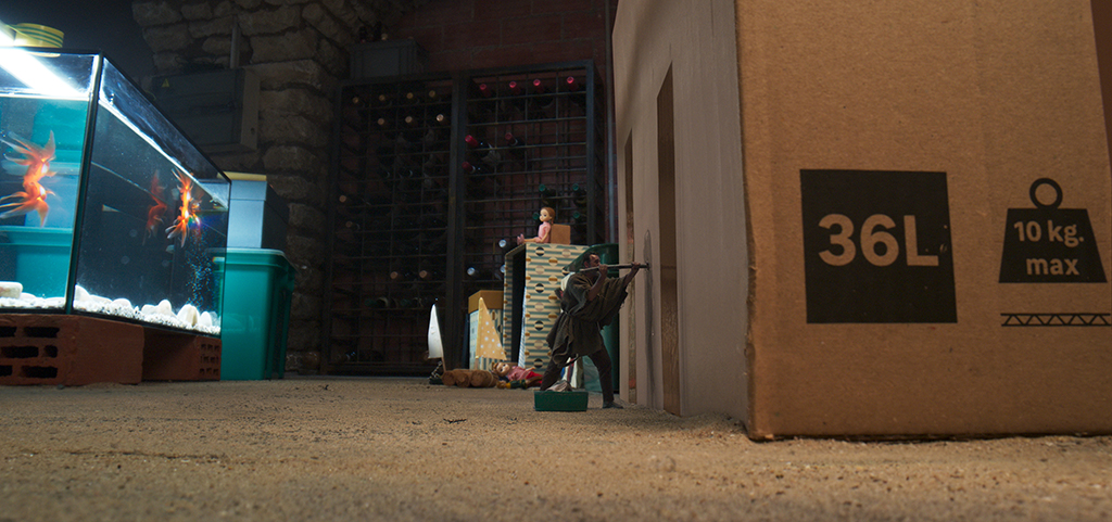 The desire was to allow Jan Kounen to shoot whatever he wanted with Jean Dujardin. “The main set had bluescreen everywhere, and we shot the actor on the ground or in front of some oversized props,” explains Benoit De Longlée, Visual Effects Supervisor at Mac Guff. “The primary action is in the basement, so that set exists somewhere else. It’s a fake set but at the human scale. We know that the action takes place in front of the stairs or anywhere in the room. We scan that set with the lighting made by the DP and everything chosen by the set designer so we have a digital version. Everything is exactly in the right place. Because of the system attached to the camera when shooting the actor, we know exactly where we are supposed to be in the basement so we can perfectly align the stairs to the oversized version of the stairs. The window is slightly higher, so I can put a mark on the bluescreen and tell the actor ‘It’s there.’ We record him in front of the bluescreen. Once we have that mock-up, we can take the motion of the camera and depending of the size of the actor, scale it down to 10 cm, 20 cm or 6 cm depending on the sequence. We put that motion inside of the motion control arm. Because we’re shooting really small, we have specific lenses, like a periscope or probe, which are extremely thin. We can place the camera in front of the stairs at the exact same position that we used with the virtual environment in the background, and then we shoot it again, but that time with the human-size set. We merge the two passes together, and that’s where classic visual effects are involved because we need to extend the ground, make sure that the texture, color and lighting look the same, and add a lot of other elements on top of that.”
