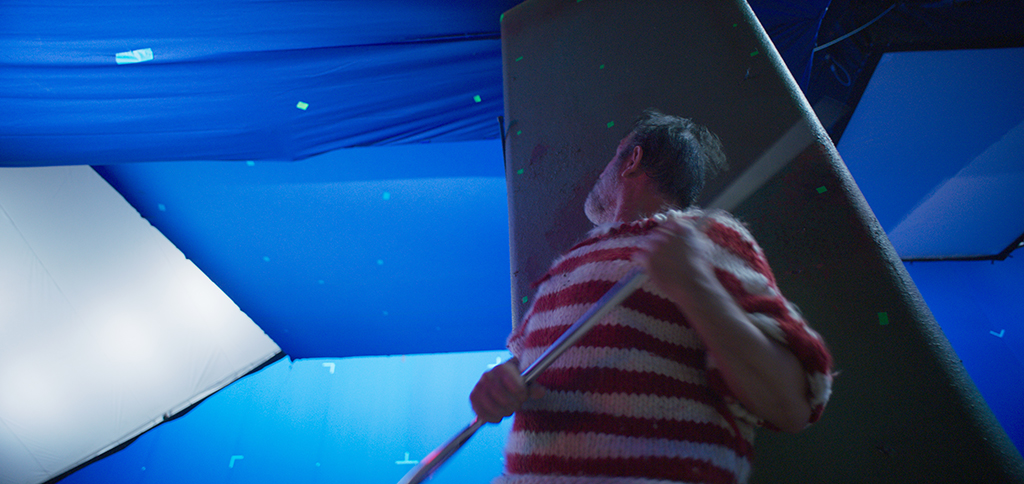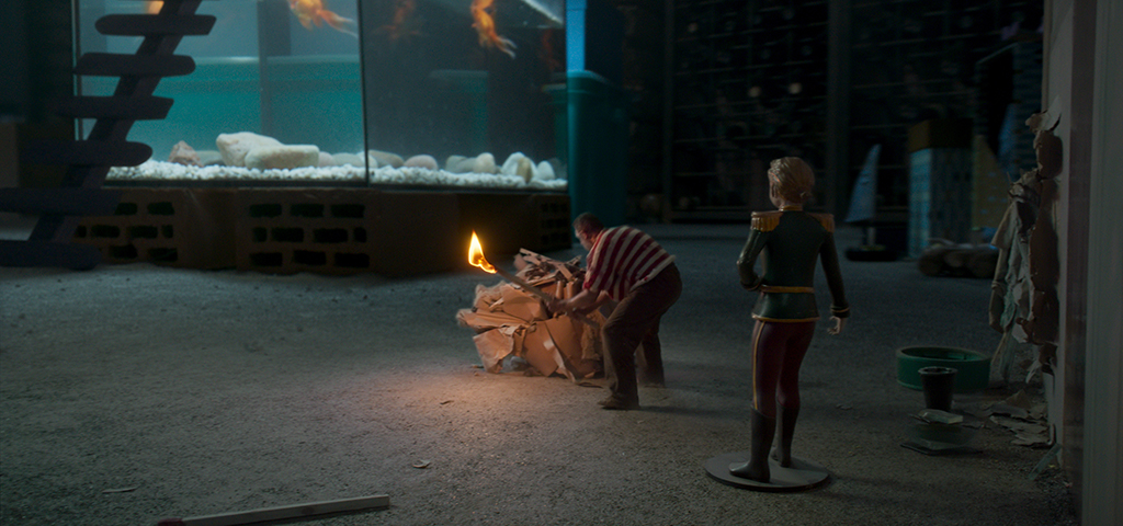 Discussions at the beginning of the production explored how physics works at the macro level, like when a match gets ignited. “That was actually tricky!” De Longlée laughs. “We had an oversized match with a LED head that could be turned on and off on set to fake the lighting contribution of the fire. The actor plays with that, then in CG we track the match and put digital fire. The hard part is, at that size, the shape of the flame is extremely simple, and we had to find something more interesting and complex. It’s a sweet spot between reality and what you want to see as a viewer.” A massive water droplet falls on the protagonist. “During the shoot, we added glycerin to thicken the water, so when the actor played with the water it was like a gel,” De Longlée describes. “If you have a drop of water hitting his face, it’s not doing a lot of small droplets, but like a big splash. We tried to fake it on set and then improve it in post-production with CG droplets. Because we have the scan of the water tank, it could be projected into the frame that we shoot with the motion control camera over the CG environment. The CG environment gets the same lighting, so when we add the CG droplet inside of the shot, the reflection and refraction is using the CG environment with the correct color, lighting and shadows from the set. You believe that it is reflecting the real things in the real space.”