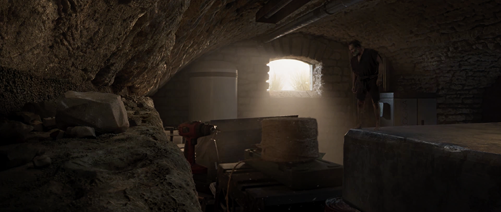 A 360-degree asset of the basement set was created virtually. “The basement was a small room,” De Longlée states. “As soon as you have three people in there, you didn’t have space for the desired camera moves. We took 3,000 high-resolution photos, so every single 10 cm was shot with two or three different cameras under various conditions and from several angles. That was stitched together, and we used LiDAR to record the position in space of every single item. We ended up with an extremely heavy scan of the basement with the real textures and dust. When we did that, I had the DP [Christophe Nuyens] do afternoon and night lighting for specific sequences. We shot the photos in different lighting conditions made by the DP so what we have in the scan is exactly what the DP wanted using the real set. It’s not built by CG artists guessing on how it should look like. It’s coming from the set.”