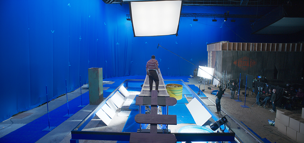 Oversized props were placed on the bluescreen stage to get the proper interaction with Jean Dujardin.