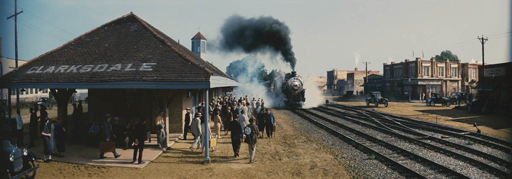 Digitally recreating 65mm film grain and lens aberrations were important to achieve seamless integration. “Ryan and Autumn were keen on making sure that the CG looked like something that’s been photographed on that film format through those lenses,” notes Nick Marshall, Visual Effects Supervisor at ILM. “We received some good lens grids from the production, and then set about making sure we could mimic every little quality of the diffraction spikes, the way the bokeh forms, chromatic aberrations, and near and far defocus.” ILM was responsible for the train station where the train was completely CG. Marshall explains, “Special effects took a steam smoke machine and ran it on a dolly down a track built next to the practical rail tracks, which were there on location. We didn’t want to go full-CG crowd for the large parts of the shots, so having that practical steam interacting with the crowd was a great way to give us something to blend into. When we designed all our train station environment extensions, we slightly repositioned our train tracks to match up with that dolly track they’d built on the location so we could have our train closer to the platform, but running down the same position as the dolly. We carefully integrated some additional steam simulations.”