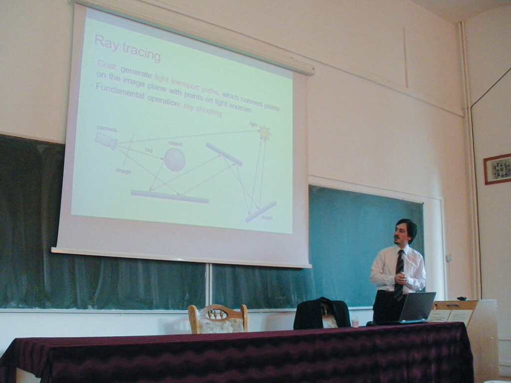 Time was spent as a teaching assistant at Babeș-Bolyai University in Romania. “I haven’t taught that much at universities, mostly during my Ph.D.,” Áfra remarks. “After a while, I felt that it wasn’t satisfying enough for me. It got repetitive because we have a curriculum, and every year you basically need to teach the same thing. However, I learned things during teaching, such as how to explain difficult concepts to people who are not really familiar with that domain; something which can be used outside of teaching.” Áfra also attended the Budapest University of Technology and Economics where he met his most influential mentor. “Professor László Szirmay-Kalos is a legend in computer graphics in Hungary. He was one of the first researchers to introduce computer graphics teaching in universities. He wrote some famous books as well, which helped many Hungarians get started and interested in the domain. Under his lead, I started my Ph.D., mostly regarding ray tracing, and that was the primary focus, which continued later on as well.”