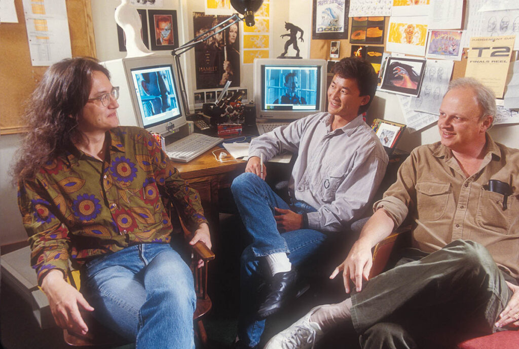 Mark A.Z. Dippé and Doug Chiang at a Terminator production meeting with Dennis Muren, VES. (Image courtesy of Industrial Light & Magic)