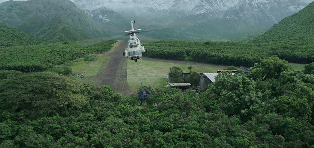 An actual Mi-8 helicopter was used during the production. “We tried to make the Mi-8 fly the general beats that were happening in the story. Because the Mi-8 is such a beast of a machine, it couldn’t do all of the necessary dramatic flying that was required. There were some shots that we could get away with adding smoke to the real helicopter, and in other ones we completely replaced it. When the full coca valley is revealed for the first time, that ended up being 90% CG. That establishing shot was based on a plate with a real flying helicopter, which was a great basis for the visual effects work; it allowed us at any moment to compare with the plate and to make sure that we were 100% photoreal.”